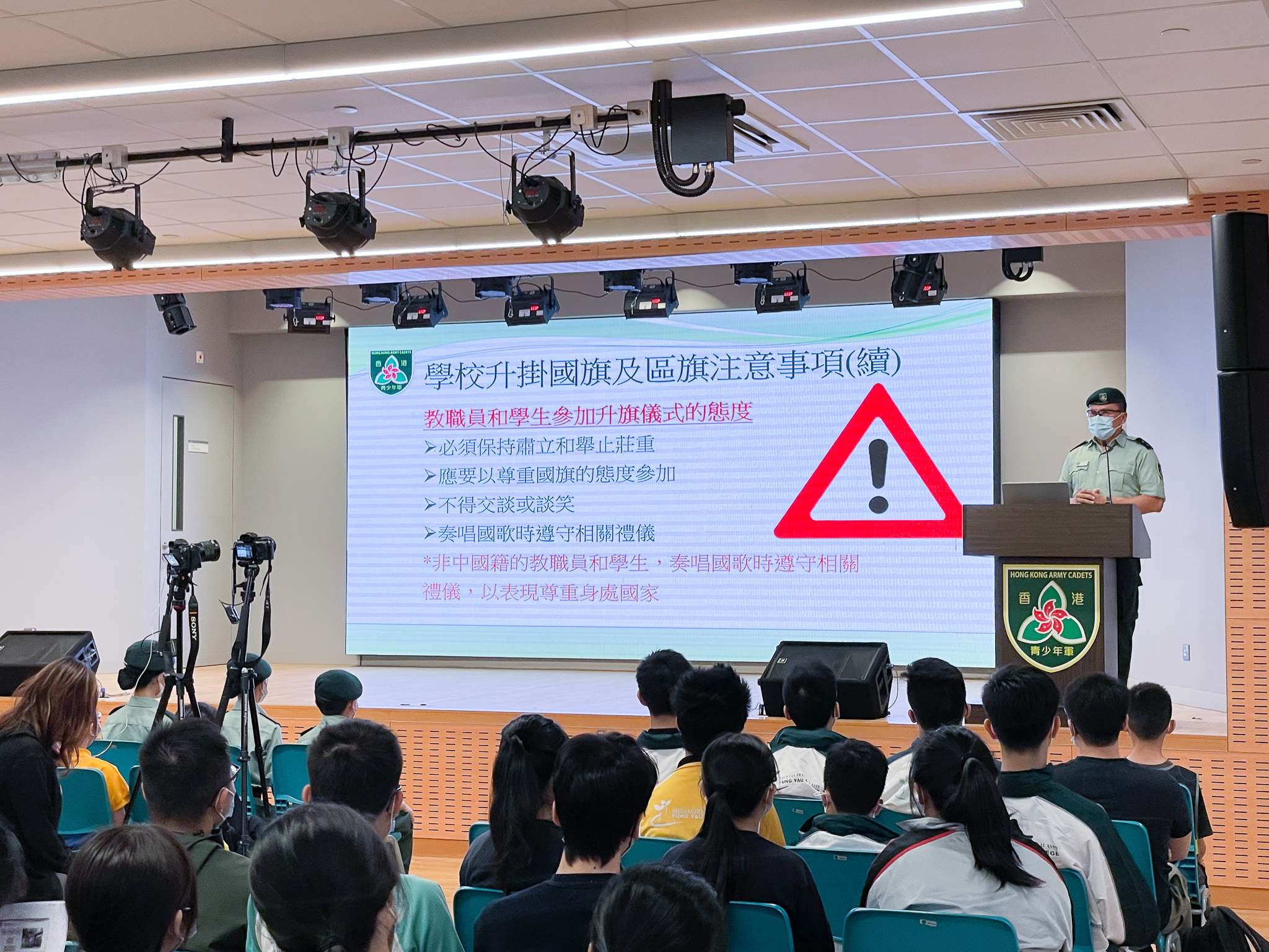 第一期開學禮共分為三部分:第一部分為課程簡介,讓教師及學生更加清晰課程內容及學習目標;第二部分講解國旗、國徽、國歌及區旗的象徵意義,令教師及學生加深有關方面的認識;第三部分講解升旗禮儀,透過講座內容,讓教師及同學瞭解懸掛國旗的方法、升旗儀式中應有的態度等。
